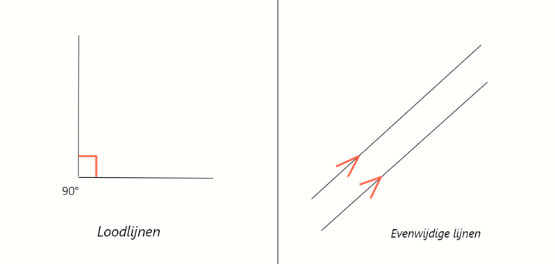 Loodlijnen zijn lijnen die loodrecht op een andere lijn staan. Hiermee vormen de 2 lijnen een hoek van 90°. Loodlijnen (en dus hoeken van 90°) geef je aan door een hoekje is de loodrechte hoek te zetten (aangegeven met rood).